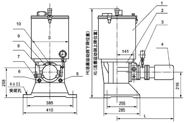 1、貯油筒;2、泵座;3、帶連結(jié)法蘭的柱塞泵裝置;4、減速電機5、加油口G3/4; 6、回油口G3/4;7、調(diào)壓安全閥;8、出油口G3/4;9、過濾器;10、單向閥