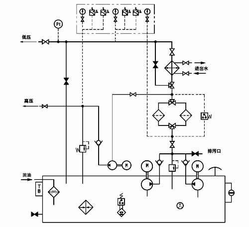 本產(chǎn)品主要由油箱(其內(nèi)裝有磁網(wǎng)過濾器)、低壓油泵裝置、高壓油泵裝置、雙筒網(wǎng)片式過濾器、手動(dòng)高壓油泵、冷卻器、管道、閥門、儀表盤及電控柜等組成。
